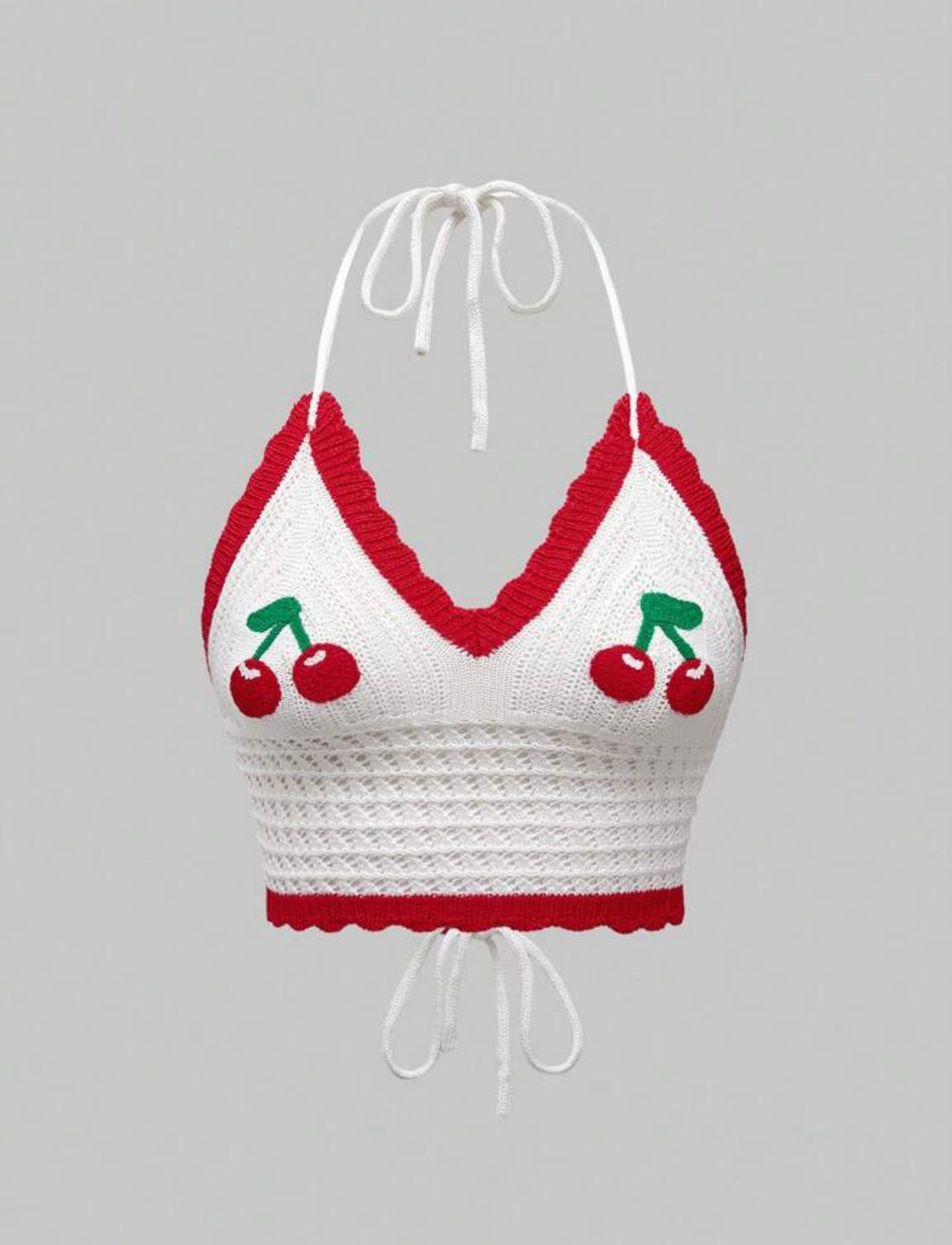 Sweetness Neck-Tied, Solid Color Patchwork Crochet Cute Cherry Knit Blouse