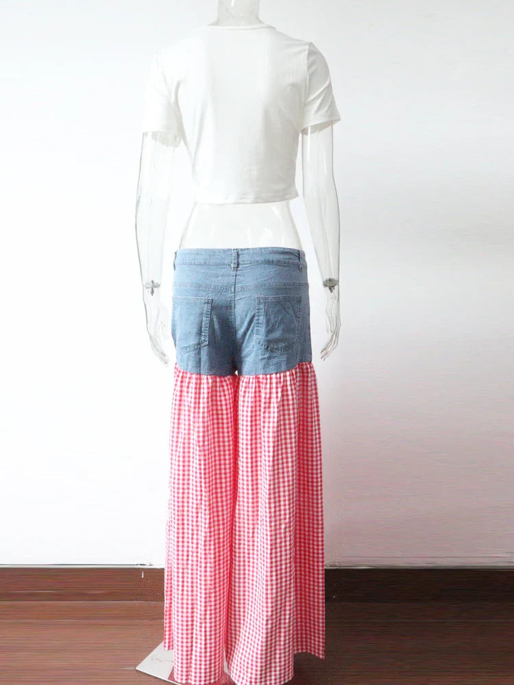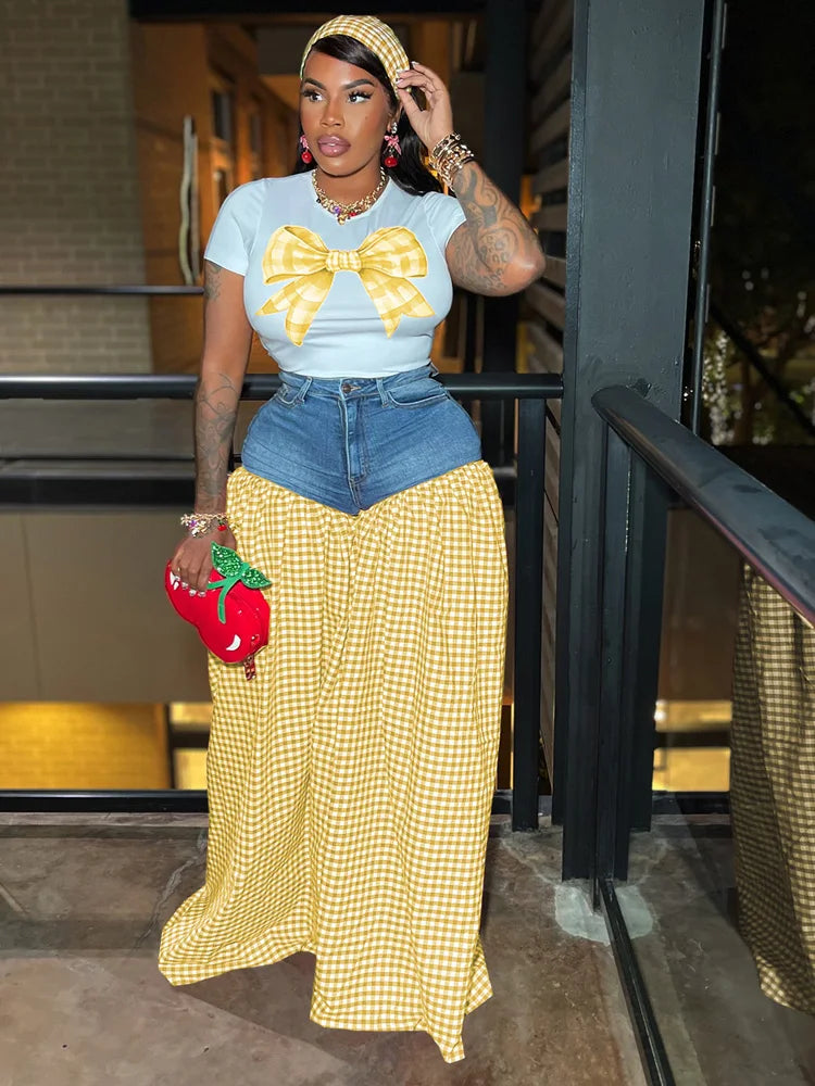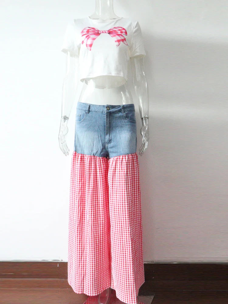 Kricesseen Women Bow Tie Shirt Top And Plaid Print Wide Leg Pant Set 2 Piece Outfits Fashion Patchwork Tracksuits Set Clubwear
