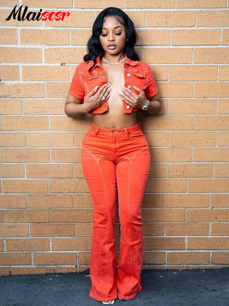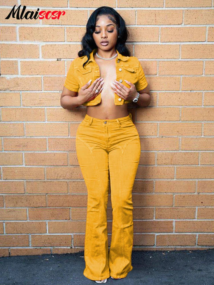 Mlaiscsr Green Denim Baddies Outfits for Women Two 2 Pieces Set Flare Jeans and Crop Top Stretch Suits Birthday Party Clubwear