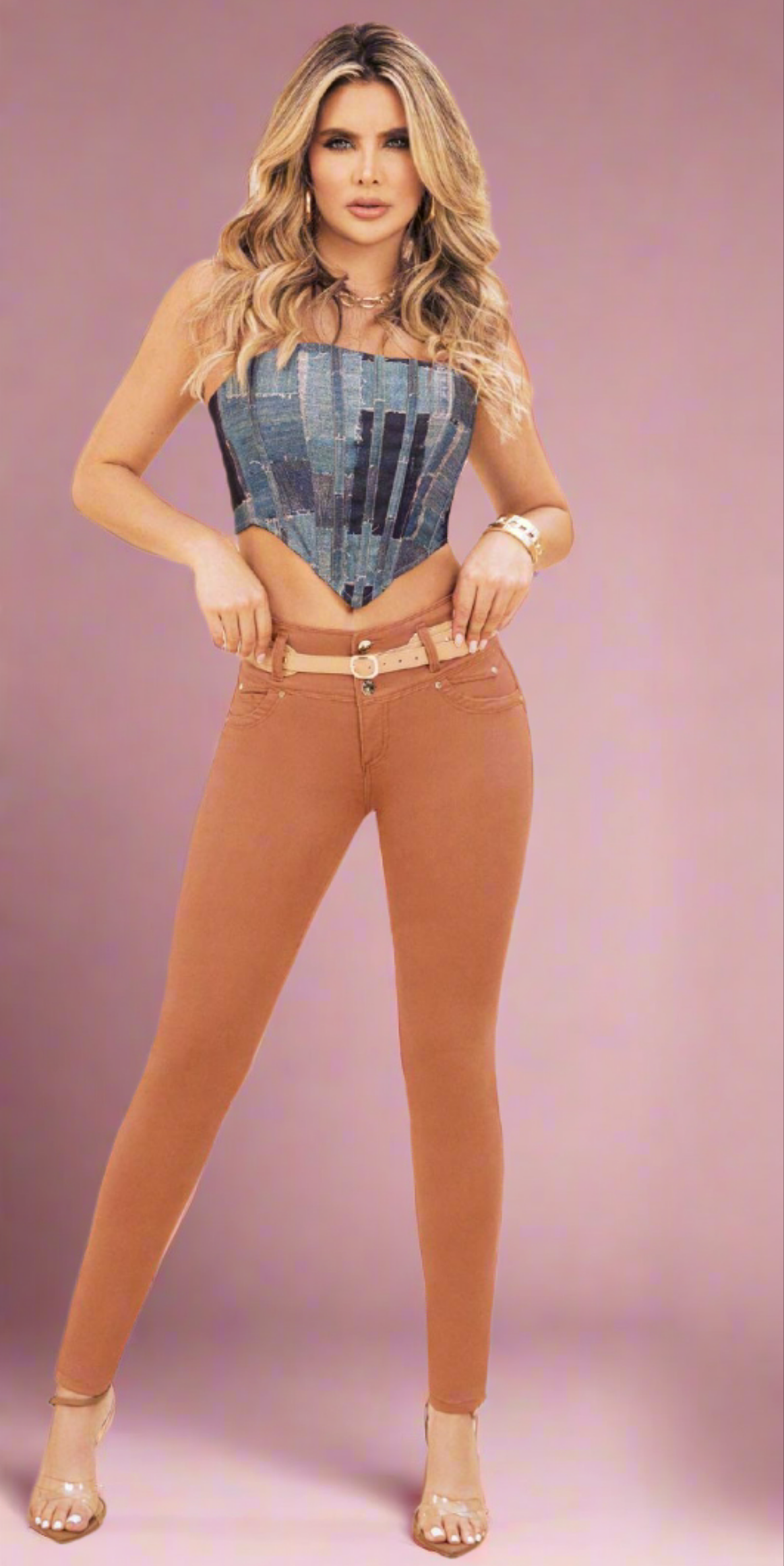 π Our SAFARI jeans offer a bold and flattering look, designed to enhance your shape with a distinctive silhouette. These terracotta/rust orange skinny jeans feature a comfortable high waist (Tiro Alto) with a distinctive three-button closure (Pretina Tiro Alto 3 Botones), and built-in tummy control for a confident figure. They come with a stylish matching belt and boast a seamless, no-pocket design (Jean Sin Bolsillo) for an exceptionally streamlined profile. Crafted with a "Piel de Durazno" (Peach Skin) effect fabric (Tela Efecto Piel de Durazno), these jeans provide incredible softness and comfortable stretch.