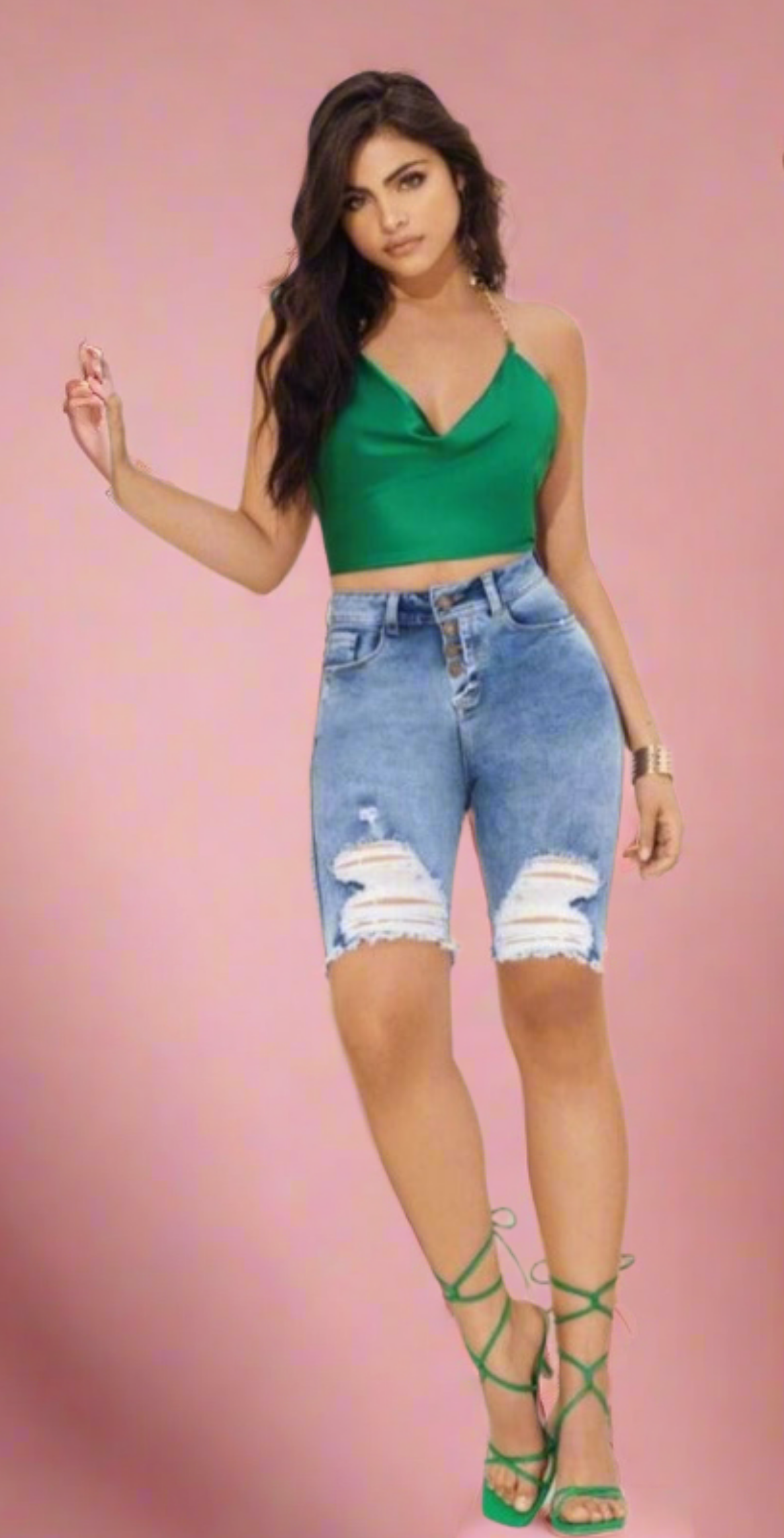 TOBAGO Colombian Push Up Biker Capris. These unique capri shorts feature a comfortable high-waist (Tiro Alto) with a chic four-button closure and built-in tummy control for a sleek silhouette. Crafted from a semi-rigid fabric (Tela Semi Rigida) in a versatile medium blue wash, the TOBAGO capris stand out with stylish distressed and ripped details and a frayed hem, offering a modern biker short look that is adjusted and tight-fitting on the leg (Short Largo Ajustado en Pierna).
